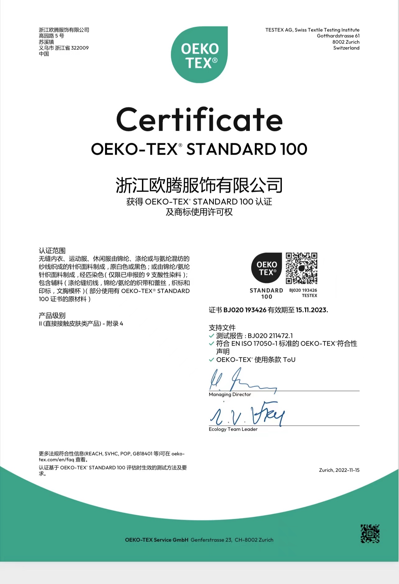 浙江歐騰服飾有限公司位于世界小商品之都-義烏。創立于2015年,是一家專業生產無縫針織運動服飾和內衣的工貿一體企業,擁有自主出口權。 工廠的占地面積約16000平方米 ,引進了大型圣東尼、高騰等多種先進的制衣設備300余臺。月產能可達90萬件。 歐騰服飾每年投入近百萬資金打樣開發新產品,有著一支高素質設計、技術員工隊伍。工廠先后通過了ISO 9001質量管理體系認證、BSCI認證、GRS認證、OEKO-TEX國際生態紡織品認證等多項專利檢測報告??商峁㎡EM&ODM服務。歐騰服飾以一套完整、科學的質量管理體系,生產的服裝從原材料紗線到成衣,質量完全能夠滿足國內、國際質量要求。獲得了客戶一致好評。工廠先后獲得省科技型企業、國家高新企業、義烏市誠信講信用單位、規上企業、信用AAA級等榮譽。